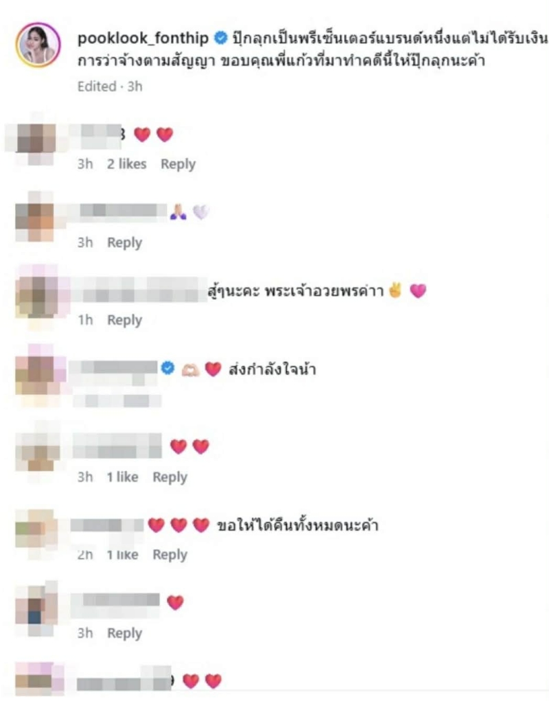 ขณะเดียวกัน แฟนคลับ และ คนในวงการต่างส่งกำลังใจให้กับนักแสดงสาวอย่างต่อเนื่อง โดยต้องรอติดตามความคืบหน้า และ บทสรุปของคดีนี้ต่อไปอย่างใกล้ชิด