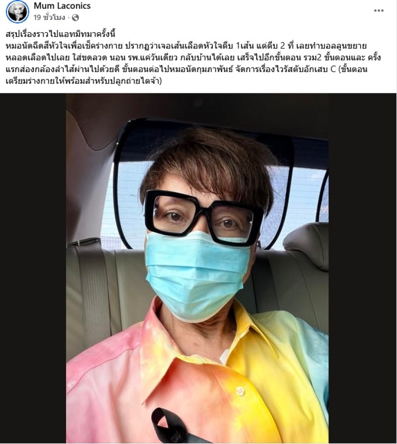 เรียกได้ว่า เป็นนักร้องรุ่นใหญ่ที่เสียงมากๆอีกคน อย่าง มัม ลาโคนิคส์ ที่กา่อนหน้านั้น แฟนๆจะทราบดีว่าได้เข้าโรงพยาบาลเพราะป่วยหนักมาก ขั้นไตวายเฉียบพลัน ล่าสุด ทางมัมได้ออกมาโพสต์ว่า สรุปเรื่องราวไปแอทมิทมาครั้งนี้ หมอนัดฉีดสีหัวใจเพื่อเช็คร่างกาย ปรากฏว่าเจอเส้นเลือดหัวใจตีบ 1เส้น แต่ตีบ 2 ที่ เลยทำบอลลูนขยายหลอดเลือดไปเลย ใส่ขดลวด นอน รพ.แค่วันเดียว กลับบ้านได้เลย เสร็จไปอีกขั้นตอน รวม2 ขั้นตอนและ ครั้งแรกส่องกล้องลำไส้ผ่านไปด้วยดี ขั้นตอนต่อไปหมอนัดกุมภาพันธ์ จัดการเรื่องไวรัสตับอักเสบ C (ขั้นตอนเตรียมร่างกายให้พร้อมสำหรับปลูกถ่ายไตจ้า)