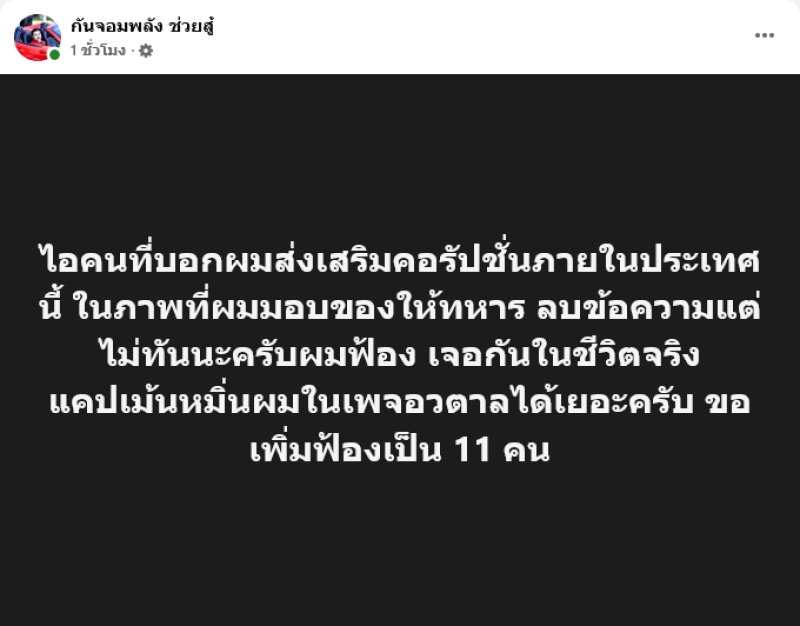ไอคนที่บอกผมส่งเสริมคอรัปชั่นภายในประเทศนี้ ในภาพที่ผมมอบของให้ทหาร ลบข้อความแต่ไม่ทันนะครับผมฟ้อง เจอกันในชีวิตจริง แคปเม้นหมิ่นผมในเพจอวตาลได้เยอะครับ ขอเพิ่มฟ้องเป็น 11 คน