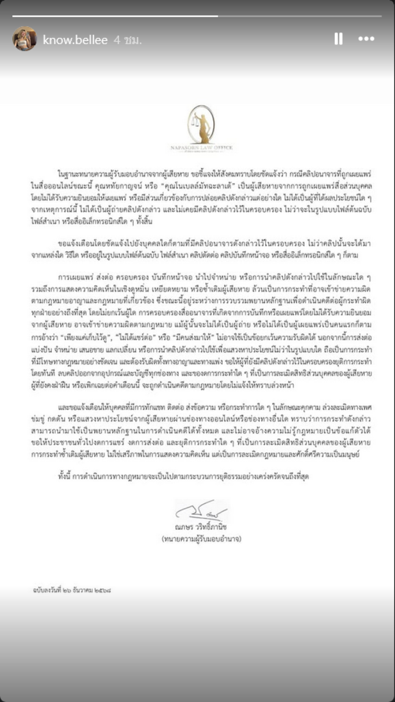 และไม่อาจอ้างความไม่รู้กฎหมายเป็นข้อแก้ตัวได้ขอให้ประชาชนทั่วไปงดการแชร์ งดการส่งต่อ และยุติการกระทำใด ๆ ที่เป็นการละเมิดสิทธิส่วนบุคคลของผู้เสียหาย การกระทำซ้ำเติมผู้เสียหาย ไม่ใช่เสรีภาพในการแสดงความคิดเห็น แต่เป็นการละเมิดกฎหมายและศักดิ์ศรีความเป็นมนุษย์ ทั้งนี้ การดำเนินการทางกฎหมายจะเป็นไปตามกระบวนการยุติธรรมอย่างเคร่งครัดจนถึงที่สุด ฉบับลงวันที่ 26 ธันวาคม 2568 #สำนักงานทนายความณภษร