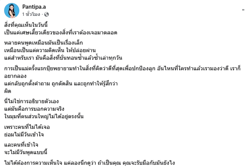 รวมถึงมีข้อความส่งมารบกวนเป็นระยะๆ บางส่วนลามไปถึงคอมเมนต์ด่าทอในเพจข่าวต่างๆสิ่งเหล่านี้เกิดขึ้นต่อเนื่องยาวนานหลายปี และไม่เคยหยุดจริงๆ ในช่วงเวลาที่คนคนหนึ่งเพิ่งผ่านการคลอด ทั้งร่างกายและจิตใจยังไม่กลับมาแข็งแรง แต่ต้องเผชิญกับคำพูด การตัดสิน และการชี้นำซ้ำแล้วซ้ำเล่า ใครที่ไม่เคยอยู่ในจุดนี้ อาจไม่เข้าใจว่ามันส่งผลต่อใจแค่ไหน