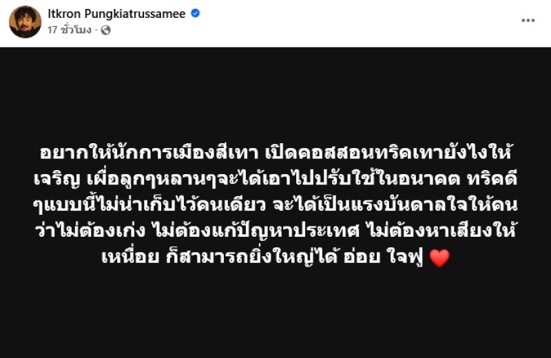 เรียกได้ว่า เป็นนักร้องหนุ่มเสียงดีอีกคนที่มีแฟนคลับเยอะมาก สำหรับ จ๋าย ไททศมิตร ที่ชอบออกมาโพสต์แนวกวนๆ ล่าสุดทำเอาแฟนๆเห็นด้วยเพียบ เมื่อเจ้าตัวได้ออกมาโพสต์ว่า อยากให้นักการเมืองสีเทา เปิดคอสสอนทริคเทายังไงให้เจริญ เผื่อลูกๆหลานๆจะได้เอาไปปรับใช้ในอนาคต ทริคดีๆแบบนี้ไม่น่าเก็บไว้คนเดียว จะได้เป็นแรงบันดาลใจให้คน ว่าไม่ต้องเก่ง ไม่ต้องแก้ปัญหาประเทศ ไม่ต้องหาเสียงให้เหนื่อย ก็สามารถยิ่งใหญ่ได้ อ่อย ใจฟู