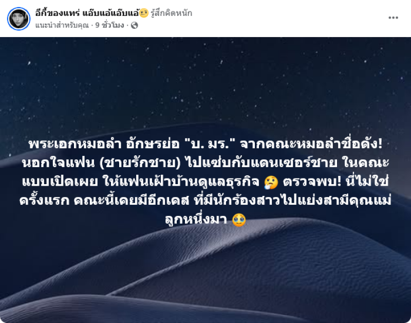 งานนี้ทำเอาสะเทือนวงการหมอลำเลยทีเดียวเมื่อมีข่าวเมาท์สนั่นออกมาว่า พระเอกหมอลำ อักษรย่อ บ. มร. จากคณะหมอลำชื่อดัง นอกใจแฟน (ชายรักชาย)