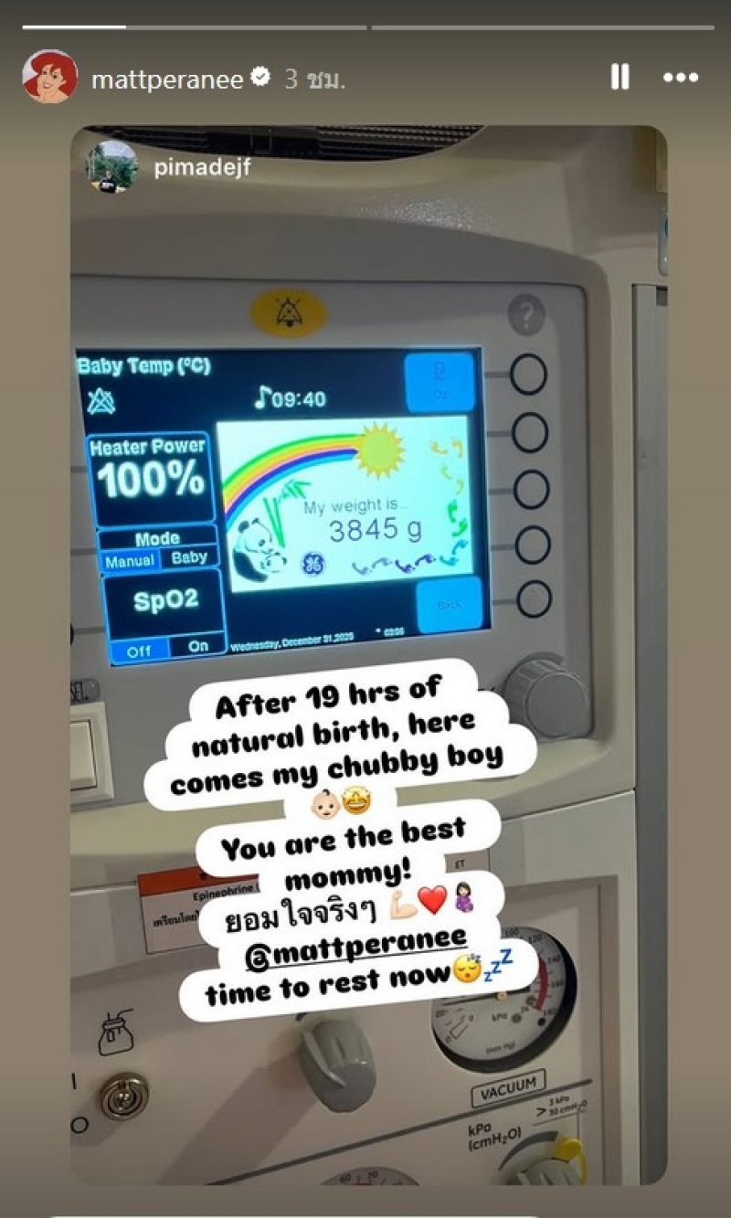 ด้าน เฟม ภีมเดช สามีของแมท ก็ได้โพสต์ภาพและเขียนข้อความว่า “After 19 hrs of natural birth, here comes my chubby boy. You are the best mommy! time to rest now zZZ” (หลังจากคลอดธรรมชาติมานานถึง 19 ชั่วโมง ในที่สุดลูกชายตัวจ้ำม่ำของผมก็ออกมาแล้ว คุณคือคุณแม่ที่เก่งที่สุดเลย! ได้เวลาพักผ่อนแล้วนะตอนนี้)
