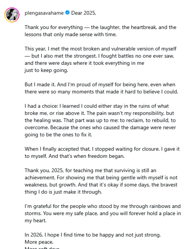 พร้อมร่ายยาวทิ้งทวนท้ายปีว่า ยอมรับว่าปี 2025 คือปีที่เธอได้เจอตัวเองในเวอร์ชันที่ แตกสลายและอ่อนแอที่สุด" แต่ก็ภูมิใจที่ผ่านมันมาได้ โดยมีประโยคเด็ดที่ทำเอาหลายคนสะดุ้งว่า ถึงปี 2025 ขอบคุณสำหรับทุกอย่าง ทั้งรอยยิ้ม ความเสียใจ และบทเรียนต่างๆ ที่ต้องใช้เวลาสักพักกว่าจะเข้าใจความหมายของมัน