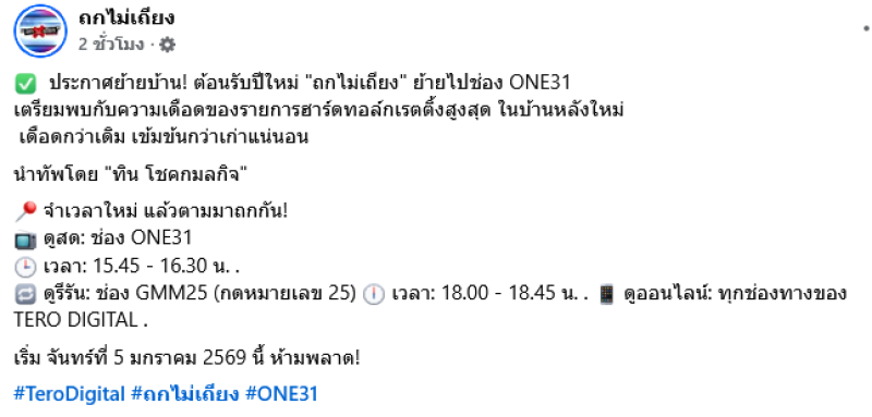 จากกรณีรายการ ถกไม่เถียง ประกาศลาจอ ช่อง7 โดยแฟนๆรายการต่างพากันใจหายไม่น้อย ล่าสุดวันที่ 1 ม.ค. 69 เพจถกไม่เถียง ได้ออกมาโพสต์ข่าวดี โดยระบุว่า ประกาศย้ายบ้าน ต้อนรับปีใหม่ ถกไม่เถียง ย้ายไปช่อง ONE31