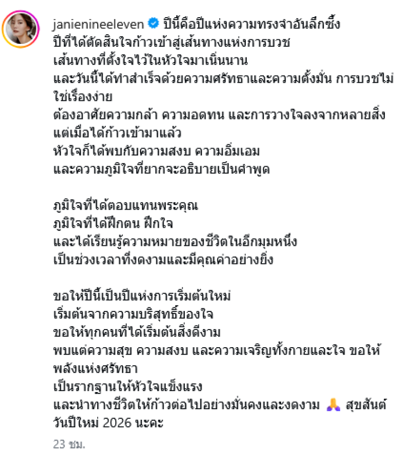 ภูมิใจที่ได้ตอบแทนพระคุณ ภูมิใจที่ได้ฝึกตน ฝึกใจ และได้เรียนรู้ความหมายของชีวิตในอีกมุมหนึ่ง เป็นช่วงเวลาที่งดงามและมีคุณค่าอย่างยิ่ง ขอให้ปีนี้เป็นปีแห่งการเริ่มต้นใหม่ เริ่มต้นจากความบริสุทธิ์ของใจ ขอให้ทุกคนที่ได้เริ่มต้นสิ่งดีงาม พลังแห่งศรัทธา เป็นรากฐานให้หัวใจแข็งแรง และนำทางชีวิตให้ก้าวต่อไปอย่างมั่นคงและงดงาม สุขสันต์วันปีใหม่ 2026 นะคะ