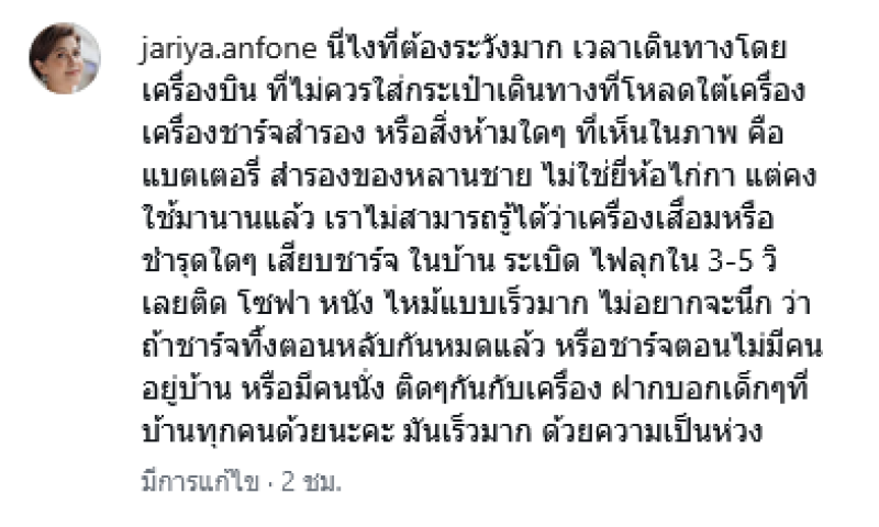 เป็นอีกหนึ่งนักแสดงเเละผู้จัดรุ่นใหญ่สำหรับ นก จริยา แอนโฟเน่ ที่ล่าสุดได้ออกมาแชร์ประสบการณ์พาวเวอร์แบงค์ของหลายชายระเบิดกลางบ้าน โดยระบุว่า นี่ไงที่ต้องระวังมาก เวลาเดินทางโดยเครื่องบิน ที่ไม่ควรใส่กระเป๋าเดินทางที่โหลดใต้เครื่อง เครื่องชาร์จสำรอง