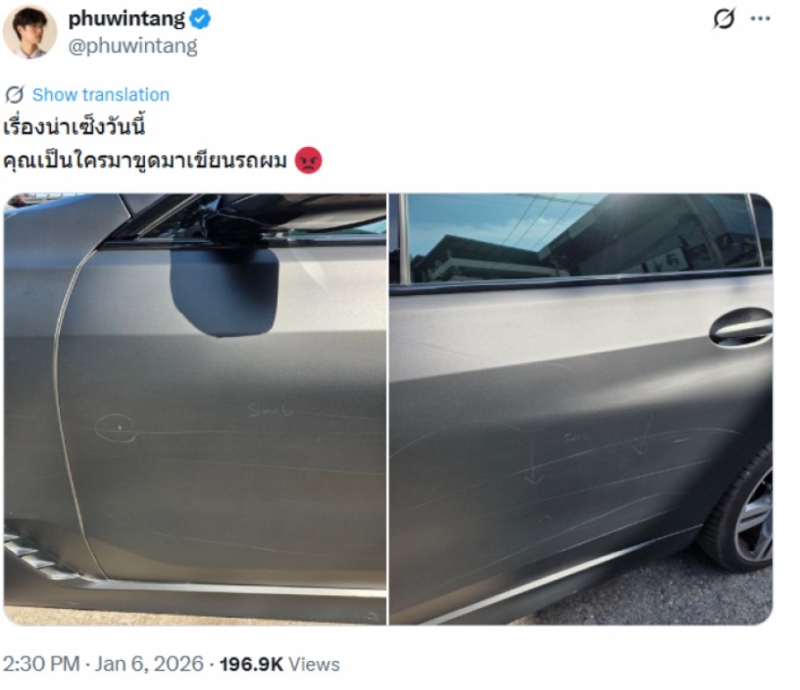 เรียกได้ว่า เป็นนักแสดงหนุ่มรุ่นใหม่ อย่าง ภูวินทร์ ตั้งศักดิ์ยืน ที่ล่าสุด เจ้าตัวได้เผยความซวยตั้งแต่ต้นปี69เลย โดยโพสต์ภาพร่องรอยที่ถูกขูด พร้อมเขียนเเคปชั่นว่า เรื่องน่าเซ็งวันนี้ คุณเป็นใครมาขูดมาเขียนรถผม