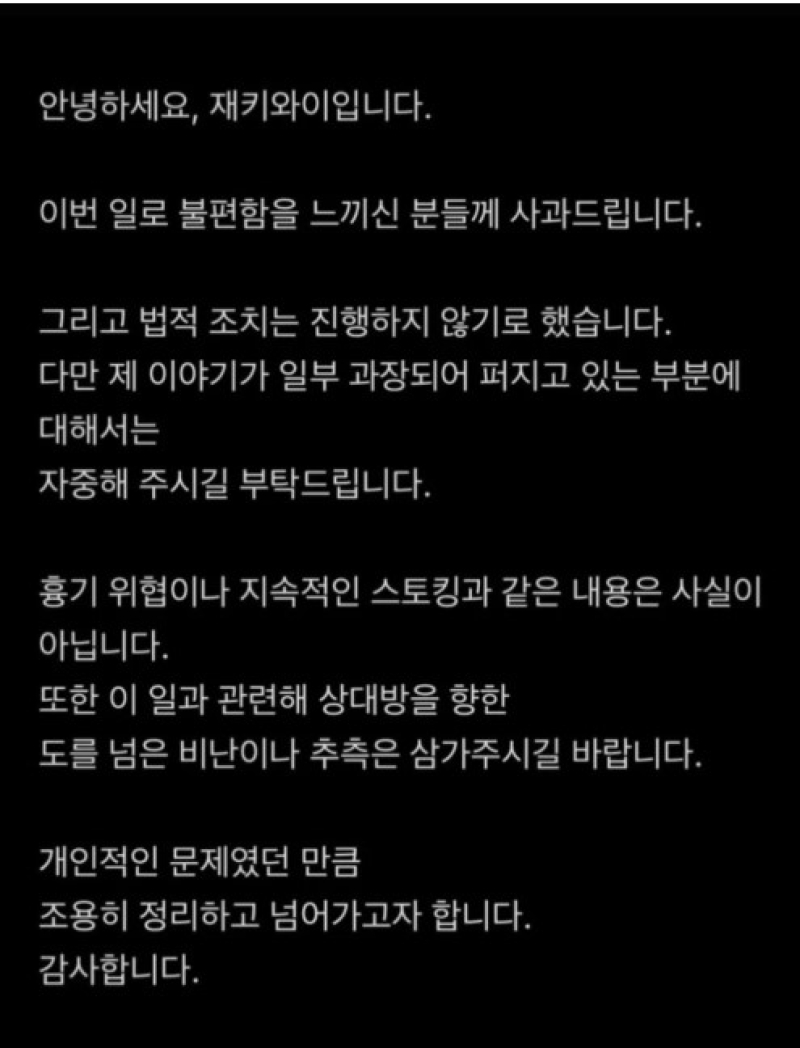 “เนื่องจากเป็นเรื่องส่วนตัว ฉันจึงอยากจะแก้ไขและเดินหน้าต่อไปอย่างเงียบๆ” เธอกล่าวสรุป พร้อมขอบคุณผู้อ่านสำหรับความเข้าใจ แม้ว่าต้นสังกัด AOMG ของเธอจะเคยระบุไว้ก่อนหน้านี้ว่าเรื่องนี้จะได้รับการจัดการผ่านกระบวนการทางกฎหมาย แต่ Jvcki Wai เองก็ประกาศถอนฟ้องด้วยตนเอง