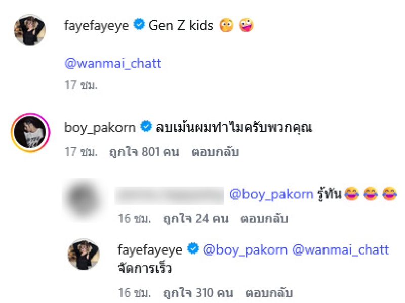 ล่าสุดน้องวันใหม่ กับ พี่เฟย์ ที่ถ่ายรูปคู่กันเช็กอินคาเฟ่ พร้อมกับแคปชั่นว่า Gen Z kids @wanmai_chatt ซึ่งงานนี้ทำเอา บอย ปกรณ์ เข้ามาคอมเมนต์ทันทีว่า ลบเม้นผมทำไมครับพวกคุณ หลังจากที่เห็นชุดของน้องวันใหม่เสื้อซีทรูเซ็กซี่เล็กๆ