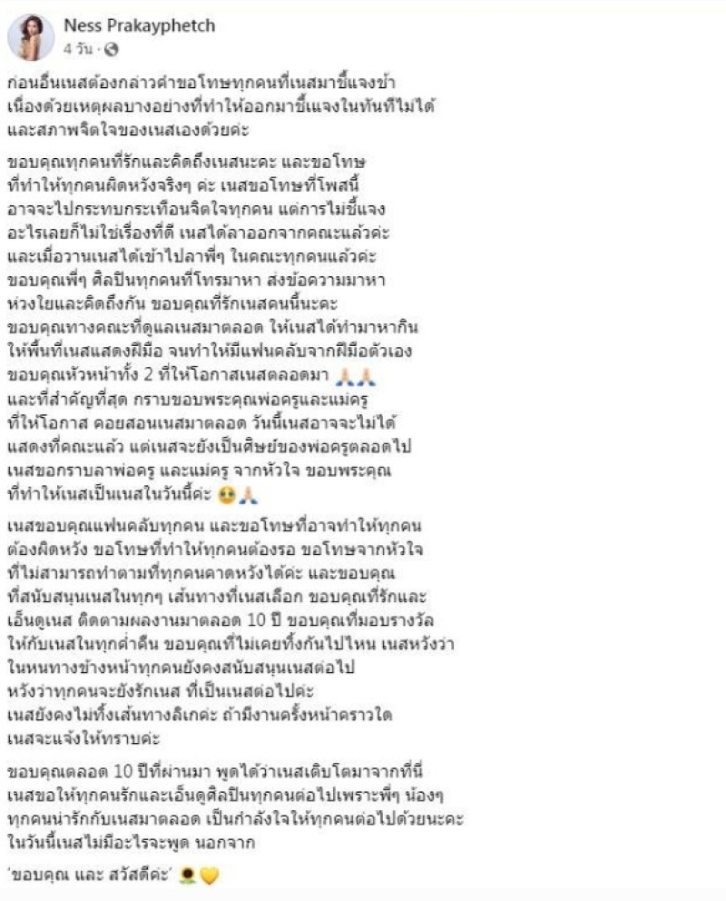 เนสขอโทษที่โพสต์นี้ อาจจะไปกระทบกระเทือนจิตใจทุกคน แต่การไม่ชี้แจงอะไรเลย ก็ไม่ใช่เรื่องที่ดี เนสได้ลาออกจากคณะแล้วค่ะ และเมื่อวานเนสได้เข้าไปลาพี่ๆ ในคณะทุกคนแล้วค่ะ ขอบคุณพี่ๆ ศิลปินทุกคนที่โทรมาหา ส่งข้อความมาหาห่วงใยและคิดถึงกัน ขอบคุณที่รักเนสคนนี้นะคะ