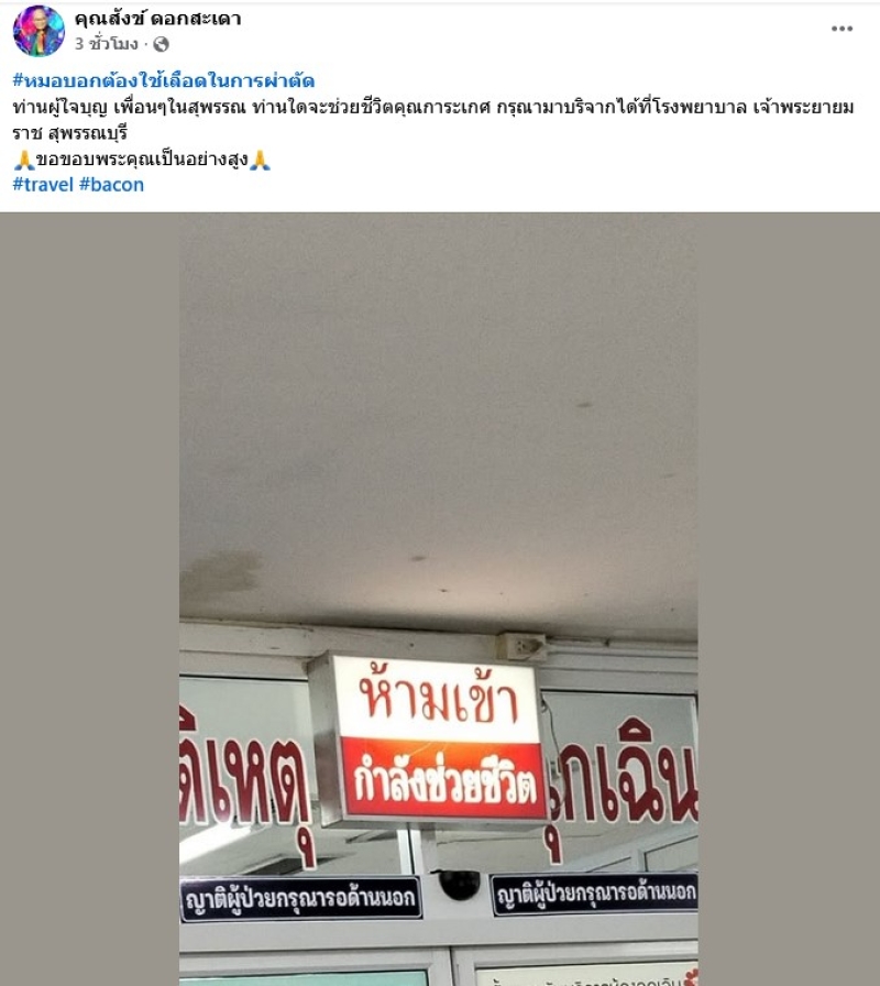 และต่อมาได้โพสต์ขอรับบริจาคเลือดว่า #หมอบอกต้องใช้เลือดในการผ่าตัด ท่านผู้ใจบุญ เพื่อนๆในสุพรรณ ท่านใดจะช่วยชีวิตคุณการะเกศ กรุณามาบริจากได้ที่โรงพยาบาล เจ้าพระยายมราช สุพรรณบุรี ขอขอบพระคุณเป็นอย่างสูง