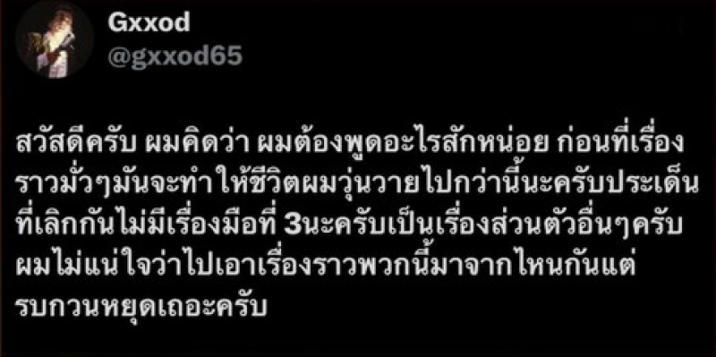 โดยก่อนหน้านั้น ทาง ก๊อต ได้ออกมาโพสต์ว่า เลิกกันจริง และย้ำไม่มีเรื่องมือที่3 โดยได้เผยว่า สวัสดีครับ ผมคิดว่า ผมต้องพูดอะไรสักหน่อย ก่อนที่เรื่อง ราวมั่วๆมันจะทําให้ชีวิตผมวุ่นวายไปกว่านี้นะครับประเด็น ที่เลิกกันไม่มีเรื่องมือที่ 3นะครับเป็นเรื่องส่วนตัวอื่นๆครับ ผมไม่แน่ใจว่าไปเอาเรื่องราวพวกนี้มาจากไหนกันแต่ รบกวนหยุดเถอะครับ