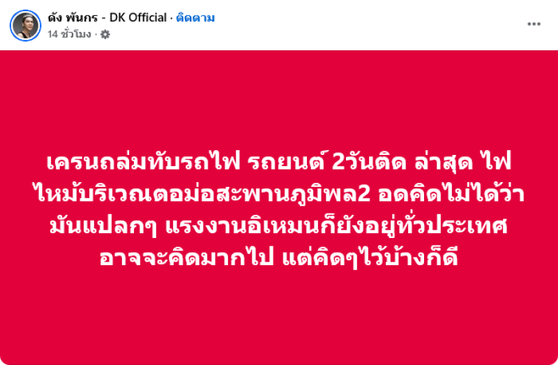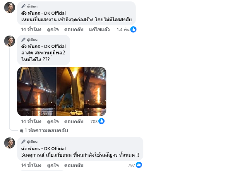 ทั้งนี้ทางด้านนักร้องอย่าง ดัง พันกร ได้ออกมาโพสต์แสดงความเห็นว่า เครนถล่มทับรถไฟ รถยนต์ 2วันติด ล่าสุด ไฟไหม้บริเวณตอม่อสะพานภูมิพล2 อดคิดไม่ได้ว่ามันแปลกๆ แรงงานอิเหมนก็ยังอยู่ทั่วประเทศ อาจจะคิดมากไป แต่คิดๆไว้บ้างก็ดี เหมนเป็นแรงงาน เข้าถึงจุดก่อสร้าง โดยไม่มีใครสงสัย