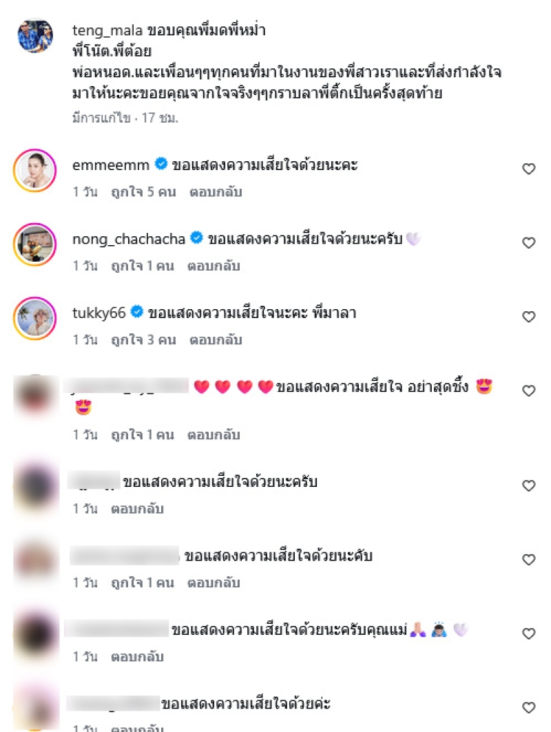 ทางด้าน แม่มาลา ได้เผยภาพบรรยากาศในงานพร้อมระบุข้อความว่า ขอบคุณพี่มดพี่หม่ำ พี่โน๊ต.พี่ต้อย พ่อหนอด.และเพื่อนๆๆทุกคนที่มาในงานของพี่สาวเราและที่ส่งกำลังใจมาให้นะคะขอยคุณจากใจจริงๆๆกราบลาพี่ติ้กเป็นครั้งสุดท้าย