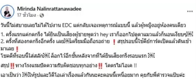 ซึ่ง เหตุเกิดคืนวันที่ 16 มกราคม 2569 ขณะ ดีเจมิรินด้า เข้าพักโรงแรมแห่งหนึ่ง เพื่อเตรียมร่วมงานเทศกาลดนตรีระดับโลก มีชายพยายามใช้คีย์การ์ดเปิดประตูห้องพัก โชคดีที่ระบบล็อกยังทำงาน เจ้าตัวจึงรอดพ้นอันตราย และรีบแจ้งความก่อนย้ายที่พักทันที