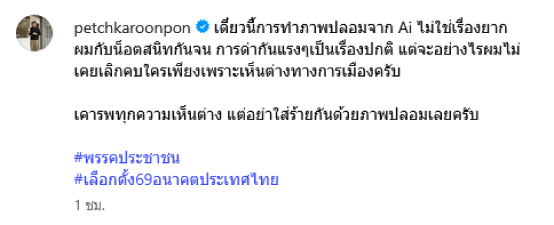 ล่าสุด เพชร กรุณพล ได้โพสต์ภาพการทะเลาะกัน พร้อมอธิบายว่า เดี๋ยวนี้การทำภาพปลอมจาก Ai ไม่ใช่เรื่องยาก ผมกับน็อตสนิทกันจน การด่ากันแรงๆเป็นเรื่องปกติ แต่จะอย่างไรผมไม่เคยเลิกคบใครเพียงเพราะเห็นต่างทางการเมืองครับ เคารพทุกความเห็นต่าง แต่อย่าใส่ร้ายกันด้วยภาพปลอมเลยครับ #พรรคประชาชน #เลือกตั้ง69อนาคตประเทศไทย