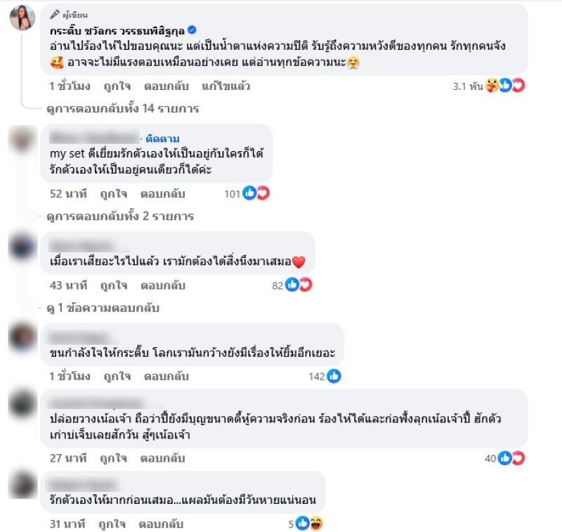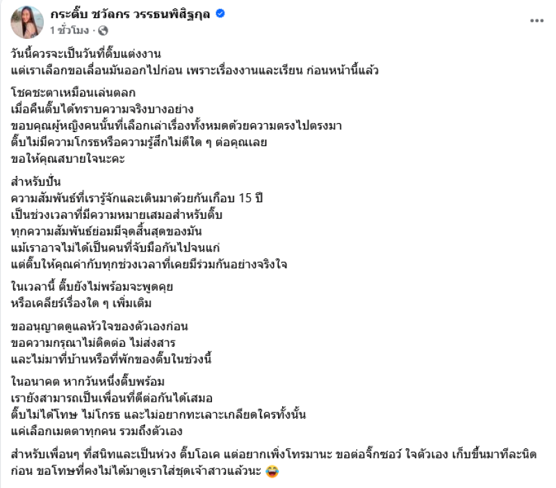 แม้เราอาจไม่ได้เป็นคนที่จับมือกันไปจนแก่ แต่ติ๊บให้คุณค่ากับทุกช่วงเวลาที่เคยมีร่วมกันอย่างจริงใจ ในเวลานี้ ติ๊บยังไม่พร้อมจะพูดคุย หรือเคลียร์เรื่องใดๆ เพิ่มเติม ขออนุญาตดูแลหัวใจของตัวเองก่อน ขอความกรุณาไม่ติดต่อ ไม่ส่งสาร และไม่มาที่บ้านหรือที่พักของติ๊บในช่วงนี้
