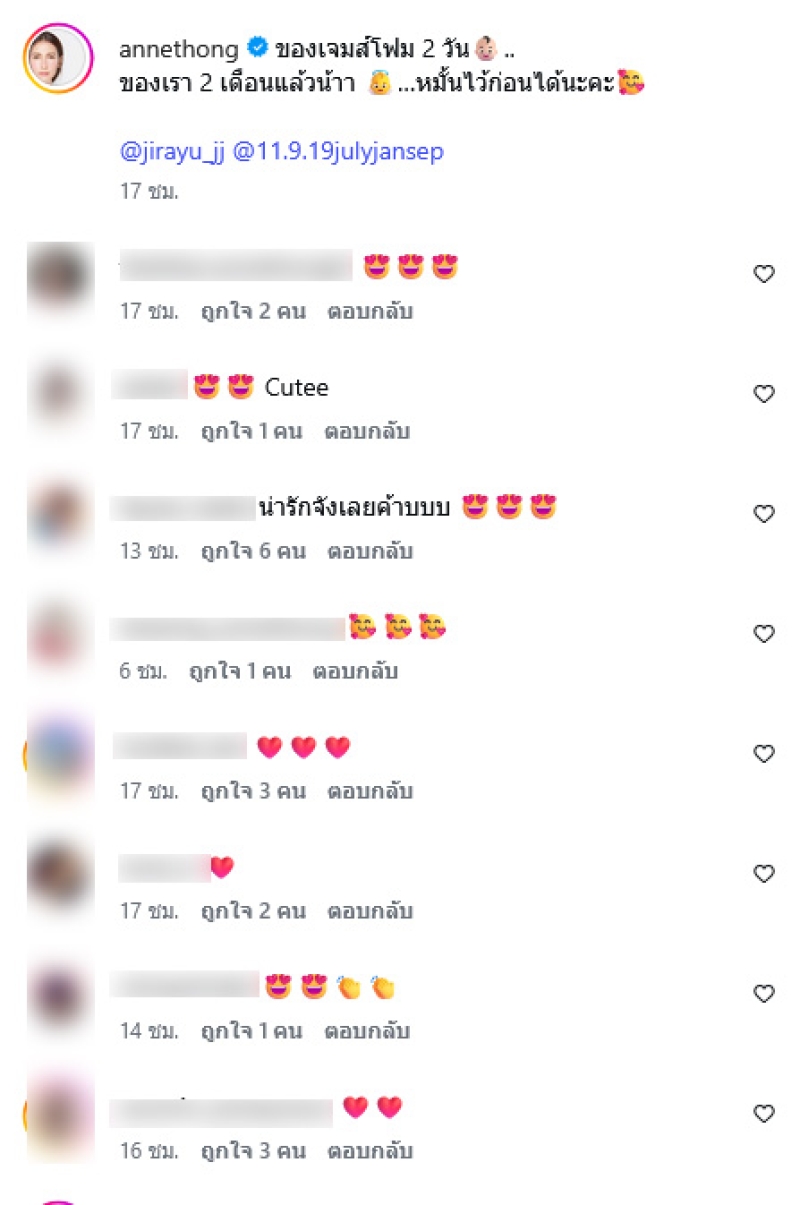 พร้อมแคปชั่นระบุว่า ของเจมส์โฟม 2 วัน ของเรา 2 เดือนแล้วน้าา หมั้นไว้ก่อนได้นะคะ @jirayu_jj @11.9.19julyjansep ท่ามกลางแฟนๆเเละคนในวงการต่างเข้ามาคอมเมนต์ชื่นชมความน่ารักกันอย่างมาก