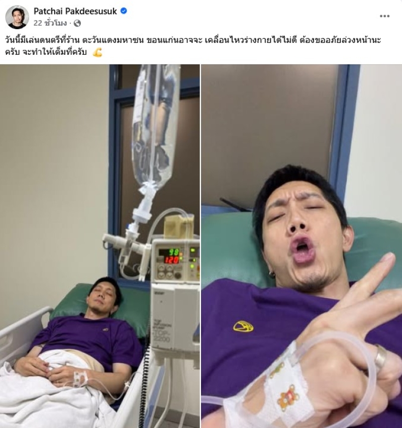เรียกได้ว่า เป็นนักร้องหนุ่มที่มีผลงานในวงการมานับไม่ถ้วน อย่าง ปั๊บ โปเตโต้ ที่ล่าสุดทำเอาแฟนๆตกใจ เมื่อเจ้าตัวออกมาโพสต์ว่า วันนี้มีเล่นดนตรีที่ร้าน ตะวันแดงมหาซน ขอนแก่นอาจจะ เคลื่อนไหวร่างกายได้ไม่ดี ต้องขออภัยล่วงหน้านะครับ จะทำให้เต็มที่ครับ ซึ่งเป็นเป็นภาพที่นอนให้น้ำเกลือ ก่อนที่จะไปทำงานต่อนั้นเอง