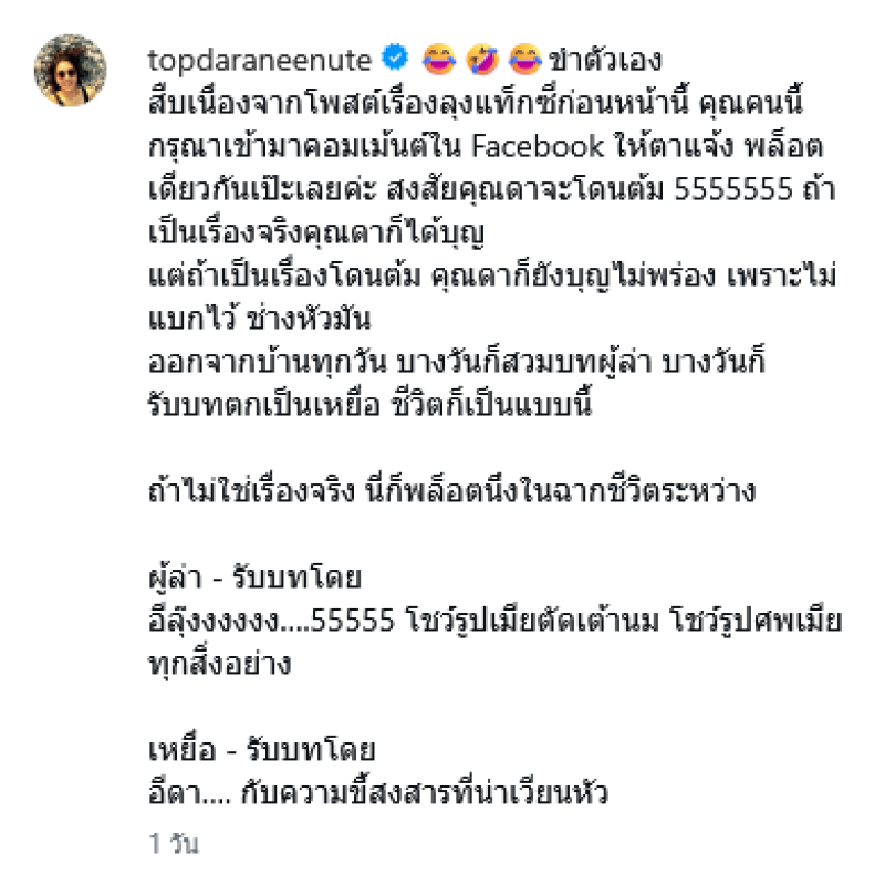 ขำตัวเอง สืบเนื่องจากโพสต์เรื่องลุงแท็กซี่ก่อนหน้านี้ คุณคนนี้กรุณาเข้ามาคอมเม้นต์ใน Facebook ให้ตาแจ้ง พล็อตเดียวกันเป๊ะเลยค่ะ สงสัยคุณดาจะโดนต้ม 5555555 ถ้าเป็นเรื่องจริงคุณดาก็ได้บุญ แต่ถ้าเป็นเรื่องโดนต้ม คุณดาก็ยังบุญไม่พร่อง เพราะไม่แบกไว้ ช่างหัวมัน ออกจากบ้านทุกวัน บางวันก็สวมบทผู้ล่า บางวันก็รับบทตกเป็นเหยื่อ ชีวิตก็เป็นแบบนี้