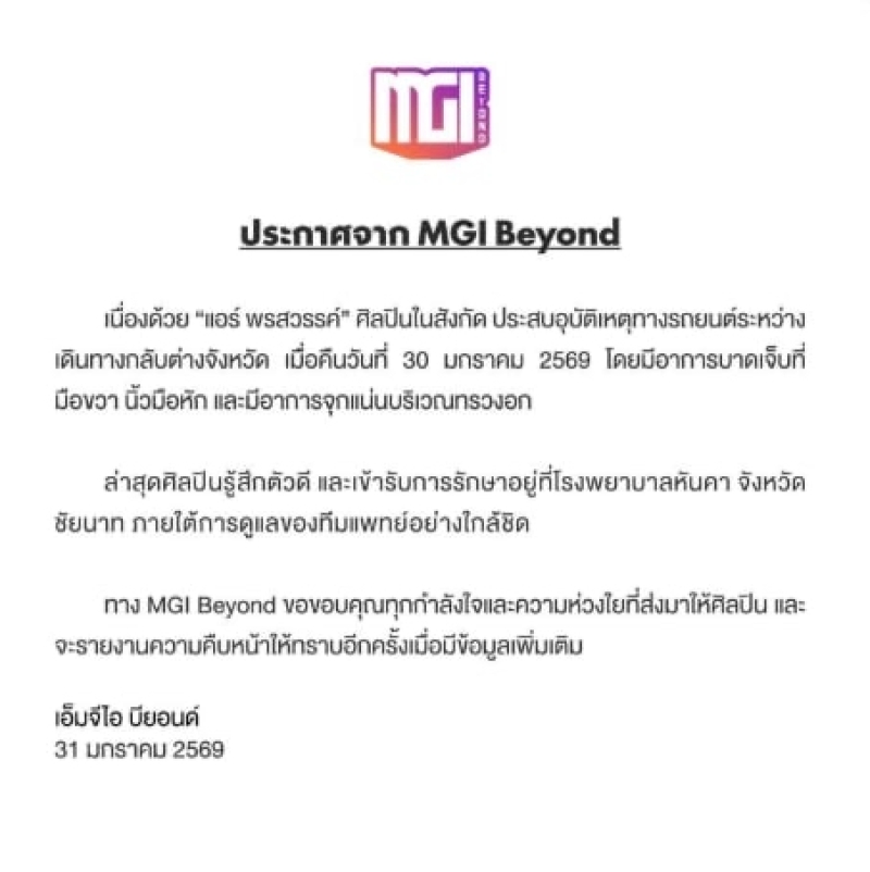 ขณะที่ทาง MGI Beyond ได้ออกมาขอบคุณทุกความห่วงใย และกำลังใจจากแฟนๆ พร้อมยืนยันว่า จะรายงานอาการ และความคืบหน้าเพิ่มเติมให้ทราบทันที หากมีข้อมูลอัปเดตเพิ่มเติม