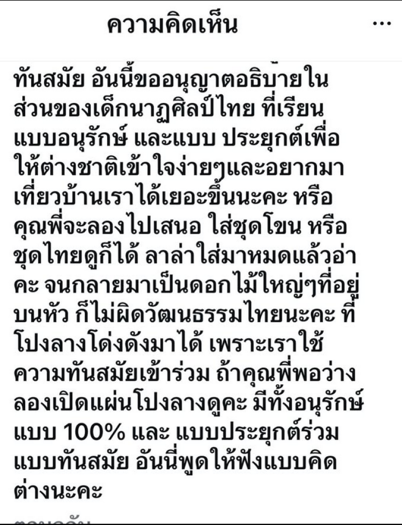 เช่นเดียวกับเพลงลูกทุ่ง ที่มีเนื้อเพลงที่ทันสมัย และดนตรีลูกทุ่งก็ย่อมมีความทันสมัย ขึ้น สิ่งที่คุณเห็น เรียกว่าศิลปะการ แสดงคะ คอนเทม มอเดิ้นอ่าคะ ศิลปะ การแสดง ไม่รู้ว่ารู้จักรึป่าว ลาล่า เรียนจบนาฏศิลป์มาคะ รู้ดีว่าอนุรักษ์ คืออะไร และทันสมัยคืออะไร เราไม่ ได้ทำลายคะ แค่นำเสนอในรูปแบบที่ ทันสมัย อันนี้ขออนุญาตอธิบายใน ส่วนของเด็กนาฏศิลป์ไทยที่เรียน