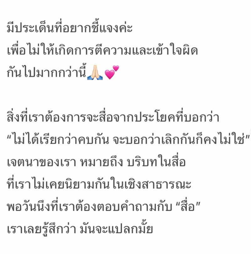 ในเรื่องของความสัมพันธ์ เรา2คนรู้กันดีอยู่แล้ว และเชื่อว่าทุกๆคนที่ได้เห็น ได้เจอกับพวกเราก็รับรู้ เราไม่ได้มีเจตนาออกมาให้สัมภาษณ์ เพื่อหาคนผิดหรือคนถูก แต่เพื่อความชัดเจน และตอบคำถามของ ใครหลายๆคนเท่านั้นเองค่า ขอบคุณทุกคนมากๆที่ให้กำลังใจ และหวังว่า เรื่องนี้จะไม่ถูกนำมาเป็นประเด็น เพื่อทำร้ายฝ่ายใดฝ่ายหนึ่งนะคะ