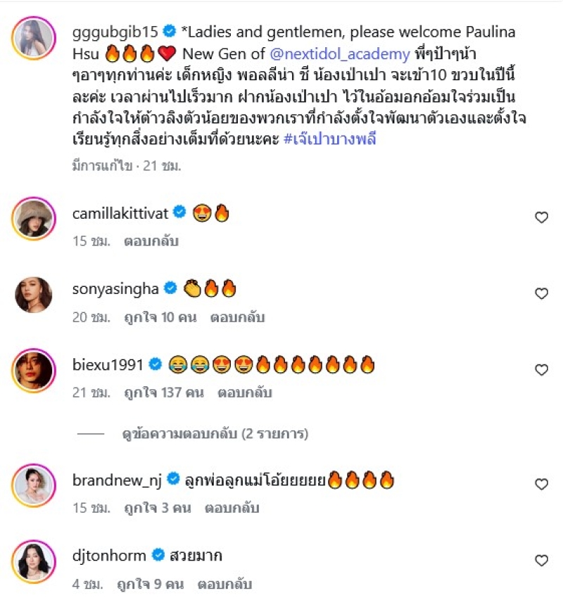 เรียกได้ว่า เป็นครอบครัวที่น่ารักมากๆ อย่าง กุ๊บกิ๊บ สุมณทิพย์ และสามี บี้ ธรรศภาคย์ โดยมีลูกสาวคนโต อย่าง น้องเป่าเปา ที่ช่วงนี้ดูโตมาก ล่าสุดทางกุ๊บกิ๊บ ได้โพสต์รูปน้องเป่าเปา บอกเลยว่าสวยมาก พร้อมระบุแคปชั่นว่า *Ladies and gentlemen, please welcome Paulina Hsu New Gen of @nextidol_academy พี่ๆป้าๆน้าๆอาๆทุกท่านค่ะ เด็กหญิง พอลลีน่า ชี น้องเป่าเปา จะเข้า10 ขวบในปีนี้ละค่ะ เวลาผ่านไปเร็วมาก ฝากน้องเป่าเปา ไว้ในอ้อมอกอ้อมใจร่วมเป็นกำลังใจให้ต้าวลิงตัวน้อยของพวกเราที่กำลังตั้งใจพัฒนาตัวเองและตั้งใจเรียนรู้ทุกสิ่งอย่างเต็มที่ด้วยนะคะ #เจ๊เปาบางพลี