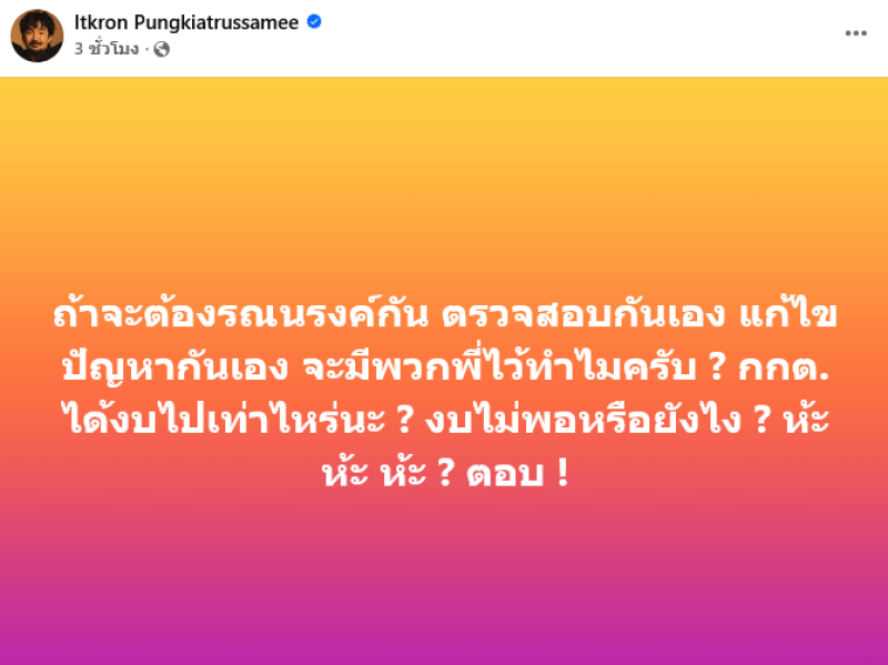 ถ้าจะต้องรณรงค์กัน ตรวจสอบกันเอง แก้ไขปัญหากันเอง จะมีพวกพี่ไว้ทำไมครับ ? กกต. ได้งบไปเท่าไหร่นะ ? งบไม่พอหรือยังไง ? ห้ะ ห้ะ ห้ะ ? ตอบ ! โดยมีหลายคนต่างเข้ามาคอมเมนต์เห็นด้วยกันอย่างมาก