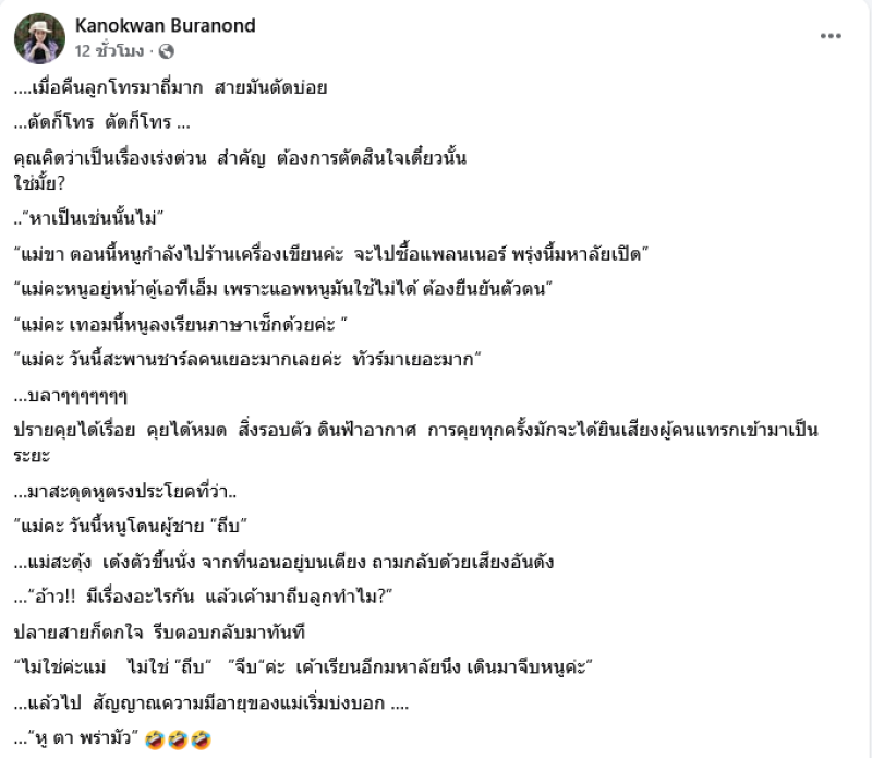 เรียกได้ว่า เป็นโมเมนต์น่ารักๆ อย่าง ปู กนกวรรณ ที่ได้ออกมาโพสต์ที่คุยกับลูกสาว น้องปราย ที่ไปเรียนอยู่ที่ต่างประเทศ โดยได้เผยว่า “เมื่อคืนลูกโทรมาถี่มาก สายมันตัดบ่อย …ตัดก็โทร ตัดก็โทร …คุณคิดว่าเป็นเรื่องเร่งด่วน สำคัญ ต้องการตัดสินใจเดี๋ยวนั้น ใช่มั้ย? ..หาเป็นเช่นนั้นไม่”