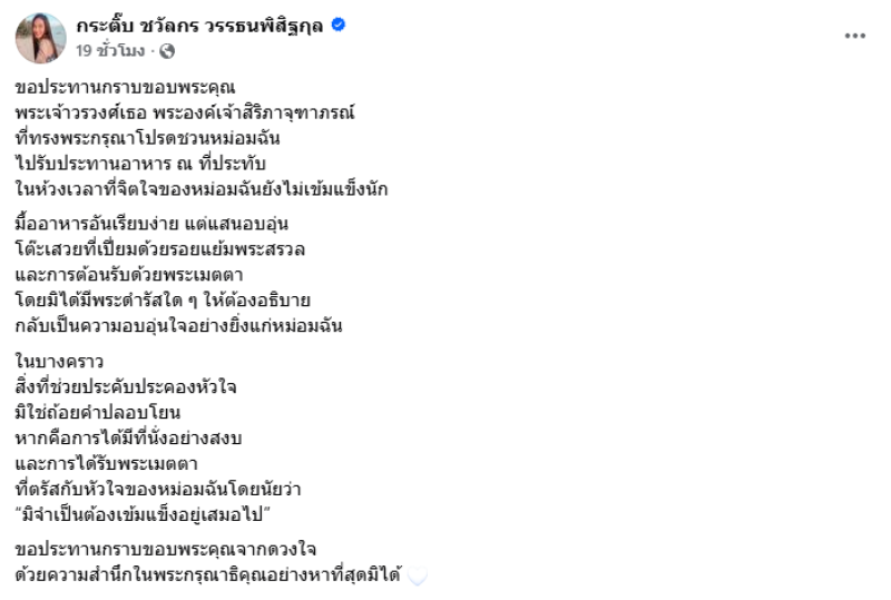 ในบางคราว สิ่งที่ช่วยประคับประคองหัวใจ มิใช่ถ้อยคำปลอบโยน หากคือการได้มีที่นั่งอย่างสงบ และการได้รับพระเมตตา ที่ตรัสกับหัวใจของหม่อมฉันโดยนัยว่า “มิจำเป็นต้องเข้มแข็งอยู่เสมอไป” ขอประทานกราบขอบพระคุณจากดวงใจ ด้วยความสำนึกในพระกรุณาธิคุณอย่างหาที่สุดมิได้