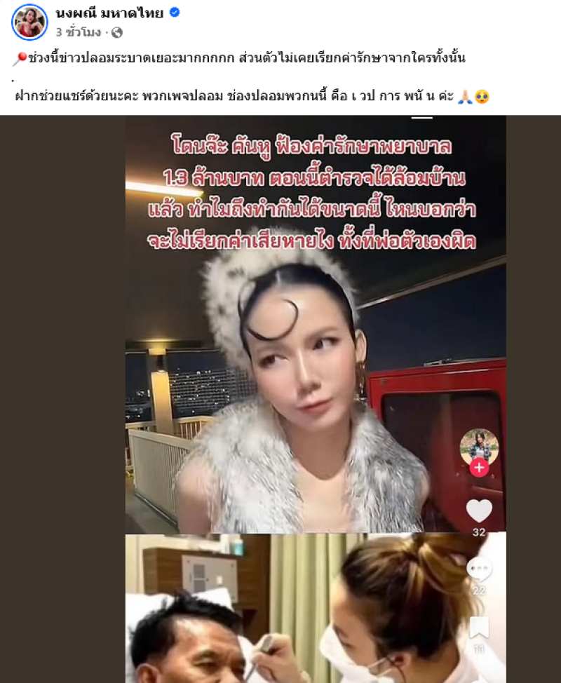 ล่าสุดกลับมีข่าวเฟคนิวส์ออกมาว่าจ๊ะได้ฟ้องค่ารักษาพยาบาล 1.3 ล้านบาท ทำเอาเจ้าตัวรีบออกมาโต้ทันทีว่า ช่วงนี้ข่าวปลอมระบาดเยอะมากกกกก ส่วนตัวไม่เคยเรียกค่ารักษาจากใครทั้งนั้น ฝากช่วยแชร์ด้วยนะคะ พวกเพจปลอม ช่องปลอมพวกนนี้ คือ เ วป การ พนั น ค่ะ