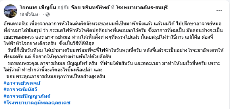 ล่าสุด เจ้าตัวได้ออกมาเผยอาการว่า อัพเดทครับ: เนื่องจากอาการหัวใจเต้นผิดจังหวะของผมที่เป็นมาพักนึงแล้ว แล้วผมได้ ไปปรึกษาอาจารย์หมอ ที่ผ่านมาได้ข้อสรุป ว่า กระแสไฟฟ้าหัวใจผิดปกติอย่างที่เคยบอกไว้ครับ ซึ่งอาการที่ผมเป็น มันค่อนข้างจะเป็นเยอะพอสมควร และ อาจารย์หมอ ท่านได้เห็นสิ่งต่างๆที่ตรวจไปแล้ว ก็เลยสรุปได้ว่าวิธีการ แก้ก็คือ ต้องจี้ไฟฟ้าหัวใจอย่างเดียวครับ ซึ่งเป็นวิธีที่ดีที่สุด