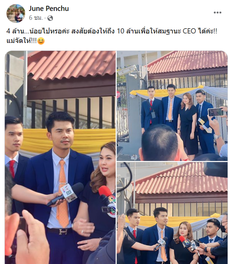 และทางด้านแม่จูนเอง ก็ได้แชร์โพสต์ของทนายไป พร้อมระบุแคปชั่นว่า 4 ล้าน…น้อยไปหรอค่ะ สงสัยต้องให้ถึง 10 ล้านเพื่อให้สมฐานะ CEO ได้ค่ะ!! แม่จัดให้