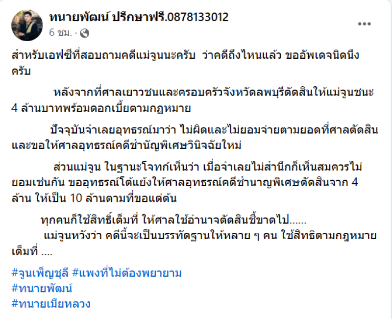 วันนี้ 9 พ.ค. 67 ด้านทนายพัฒน์ ทนายความของ แม่จูน เพ็ญชุลี อดีตภรรยา หนุ่ม กะลา ได้ออกมาโพสต์อัปเดตประเด็นฟ้องร้องมือที่สาม โดยได้เผยว่า สำหรับเอฟซีที่สอบถามคดีแม่จูนนะครับ ว่าคดีถึงไหนแล้ว ขออัพเดจนิดนึงครับ หลังจากที่ศาลเยาวชนและครอบครัวจังหวัดลพบุรีตัดสินให้แม่จูนชนะ 4 ล้านบาทพร้อมดอกเบี้ยตามกฏหมาย