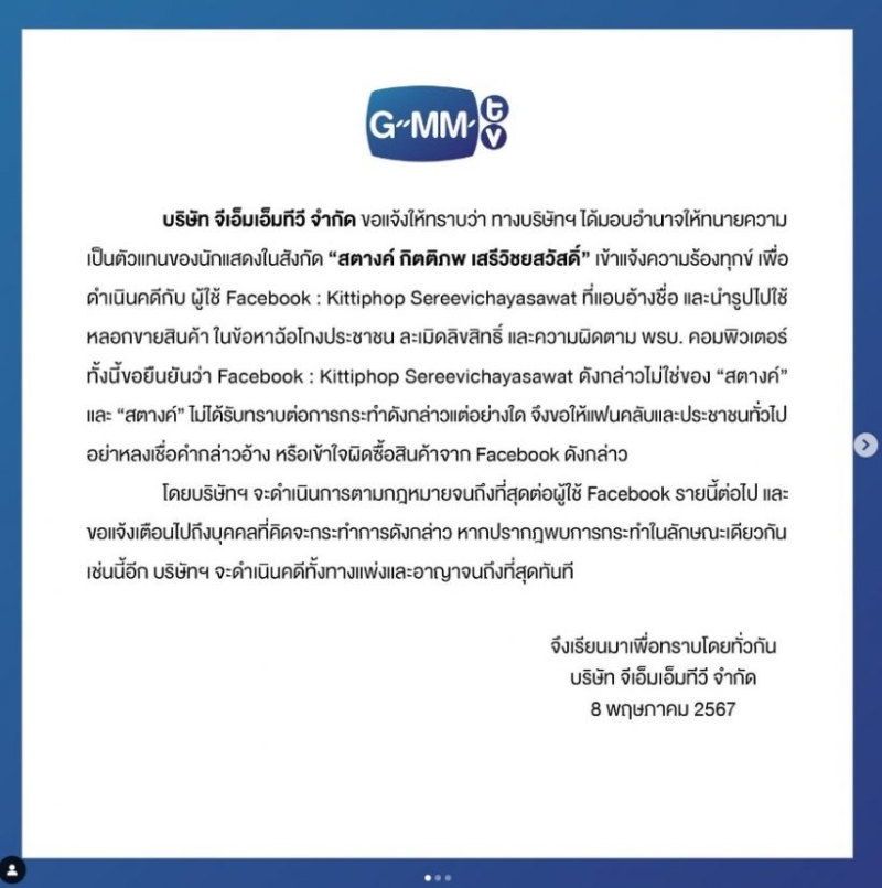 บริษัท จีเอ็มเอ็มทีวี จำกัด ขอแจ้งให้ทราบว่า ทางบริษัทฯ ได้มอบอำนาจให้ทนายความเป็นตัวแทนของนักแสดงในสังกัด "สตางค์ กิตติภพ เสรีวิชยสวัสดิ์" เข้าแจ้งความร้องทุกข์ เพื่อดำเนินคดีกับ ผู้ใช้ Facebook : Kittiphop Sereevichayasawat ที่แอบอ้างชื่อ และนำรูปไปใช้หลอกขายสินค้า ในข้อหาฉ้อโกงประชาชน ละเมิดลิขสิทธิ์ และความผิดตาม พรบ. คอมพิวเตอร์