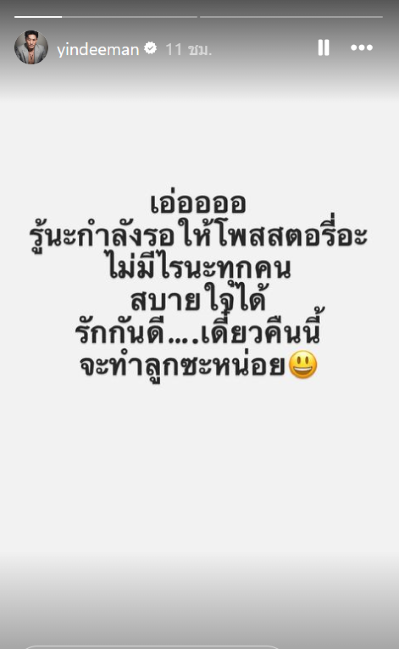 ล่าสุด ด้านสามีได้เคลื่อไหวแล้ว ได้เข้าไปคอมเมนต์รูปภรรยาว่า รักเมียคนเดียวครับ และยังได้โพสต์ ผ่านทางสตอรี่ไอจีด้วยว่า เอ่ออออ รู้นะกำลังรอให้โพสต์สตอรี่อะ ไม่มีไรนะทุกคน สบายใจได้ รักกันดี....เดี๋ยวคืนนี้จะทำลูกซะหน่อย