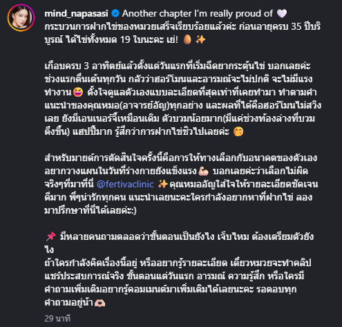 เรียกได้ว่า เกือบทำเอาแฟนๆเซอร์ไพรส์ เมื่อทาง มายด์ ณภศศิ แฟนสาวของ สงกรานต์ เตชะณรงค์ ที่ล่าสุดออกมาโพสต์รูปอัลตร้าซาวด์ โดยได้เผยว่า Another chapter I’m really proud of กระบวนการฝากไข่ของหมวยเสร็จเรียบร้อยแล้วค่ะ ก่อนอายุครบ 35 ปีบริบูรณ์ ได้ไข่ทั้งหมด 19 ใบนะคะ เย่!