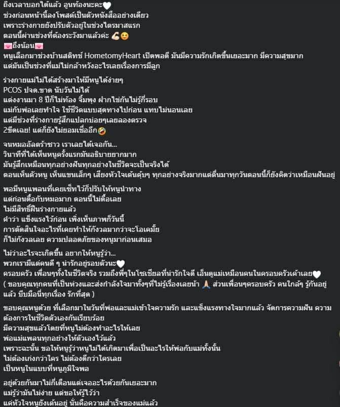 โดย เธอ เผยว่า เส้นทางสู่การมีลูกเต็มไปด้วยอุปสรรค จากภาวะ PCOS ที่ส่งผลให้ร่างกายตั้งครรภ์ได้ยาก พยายามมาหลายปีโดยไม่สำเร็จ จนแทบถอดใจ และหันไปโฟกัสการใช้ชีวิตให้เต็มที่แทน