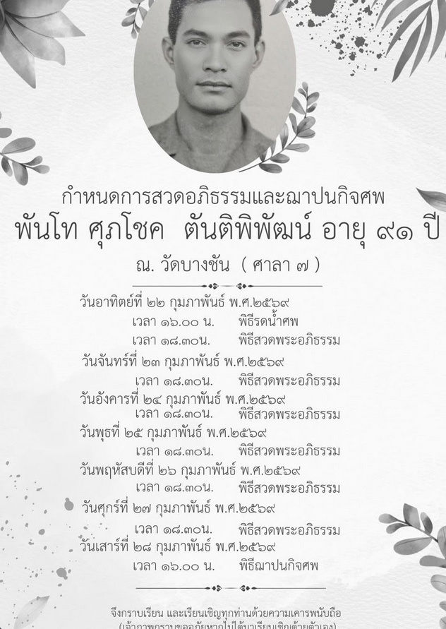 กำหนดการสวดอภิธรรมและฌาปนกิจศพ ณ. วัดบางชัน (ศาลา ๗)