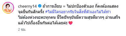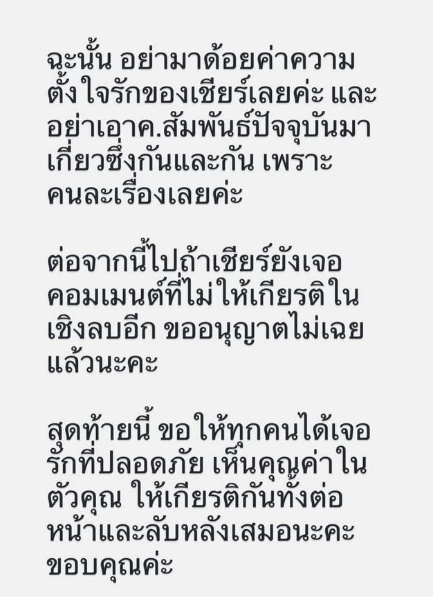 ฉะนั้น อย่ามาด้อยค่าความตั้งใจรักของเชียร์เลยค่ะ และอย่าเอาความสัมพันธ์ปัจจุบันมาเกี่ยวข้องกันและกัน เพราะคนละเรื่องเลยค่ะ ต่อจากนี้ไปถ้าเชียร์ยังเจอคอมเมนต์ที่ไม่ให้เกียรติในเชิงลบอีก ขออนุญาตไม่เฉยแล้วนะคะ สุดท้ายนี้ ขอให้ทุกคนได้เจอรักที่ปลอดภัย เห็นคุณค่าในตัวคุณ ให้เกียรติกันทั้งต่อหน้าและลับหลังเสมอนะคะ ขอบคุณค่ะ