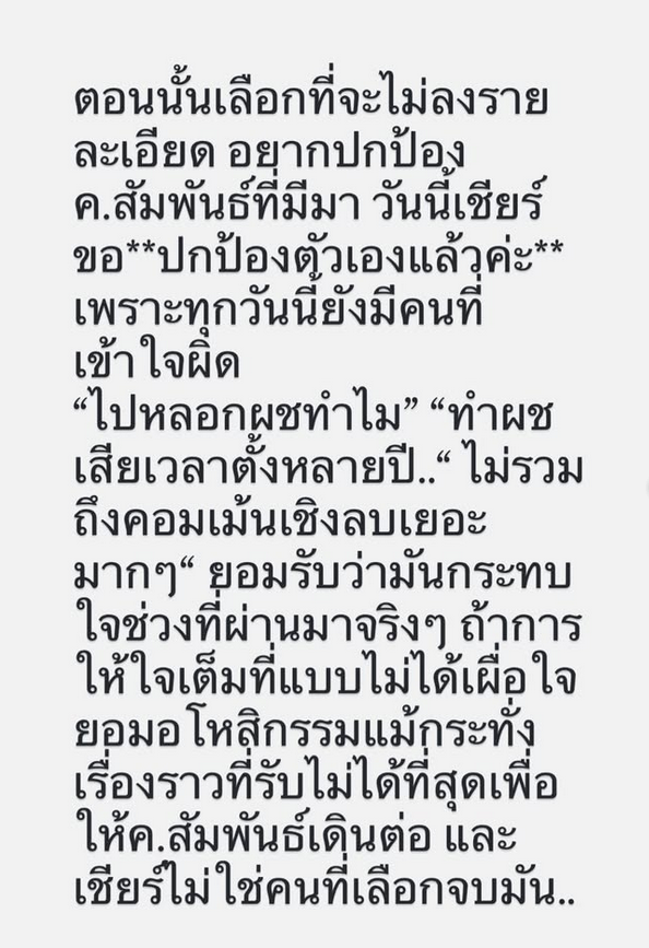 ตอนนั้นเลือกที่จะไม่ลงรายละเอียด อยากปกป้องความสัมพันธ์ที่ผ่านมา วันนี้เชียร์ขอปกป้องตัวเองแล้วค่ะ เพราะทุกวันนี้ยังมีคนที่เข้าใจผิด ไปหลอกผชทำไม ทำผชเสียเวลาตั้งหลายปี ไม่รวมถึงคอมเมนต์เชิงลบเยอะมากๆ ยอมรับว่ามันกระทบใจช่วงที่ผ่านมาจริงๆ ถ้าการให้ใจเต็มที่แบบไม่ได้เผื่อใจ ยอมอโหสิกรรมแม้กระทั่งเรื่องราวที่รับไม่ได้ที่สุดเพื่อให้ความสัมพันธ์เดินต่อ และเชียร์ไม่ใช่คนที่เลือกจบมัน
