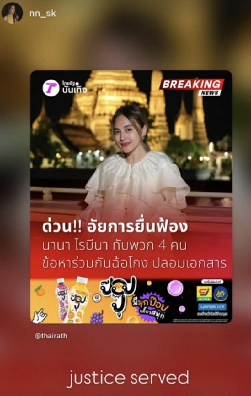 โดย เธอ แชร์ข่าวประเด็นดังกล่าวผ่านอินสตาแกรมส่วนตัว พร้อมเขียนข้อความสั้นๆ เชิงสะท้อนความรู้สึกเกี่ยวกับความยุติธรรม ทำให้ชาวเน็ตเข้ามาแสดงความคิดเห็นจำนวนมาก