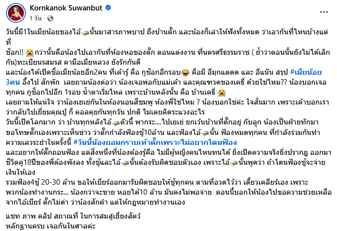 วันนี้น้องยอมกราบเท้าตั๊กเพราะไม่อยากโดนฟ้อง และอยากให้ตั๊กถอนฟ้อง แต่สิ่งหนึ่งที่น้องต้องรู้คือ ไม่มีผู้หญิงคนไหนทนได้ ยิ่งเปิดความจริงยิ่งปรากฎ ออกมา ชีวิตคู่18ปีของพี่ต้องพังลง ทั้งชู้และไอ้xxนั้นต้องรับผิดชอบตัวเอง เพราะไอ้xxนั้นพูดว่า ถ้าโดนฟ้องชู้จะจ่ายเงินให้เอง