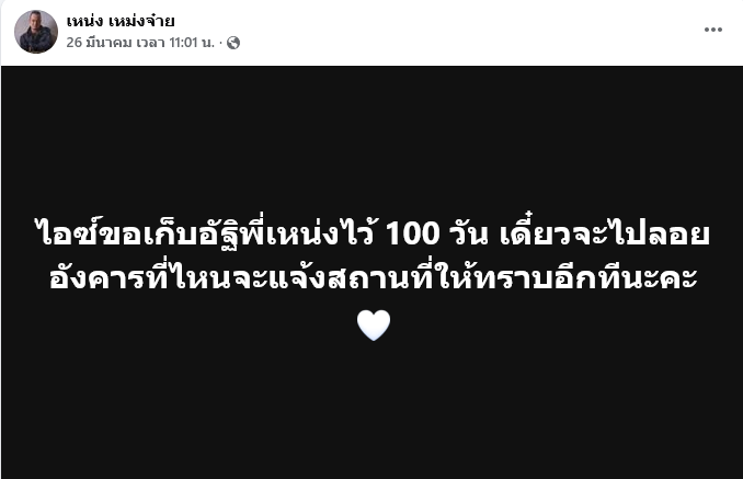 ย้อนกลับไปเมื่อวันที่ 26 มีนาคม ไอซ์ ภรรยาเหน่งเผยภาพที่ใส่อัฐิเหน่ง พร้อมข้อความบอกว่า หนูคิดถึงที่รักนะ คิดถึงมากที่สุด ไอซ์ขอเก็บอัฐิพี่เหน่งไว้ 100 วัน แล้วจะแจ้งสถานที่ลอยอังคารอีกทีนะคะทุกท่าน