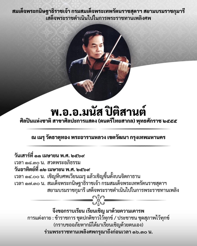 จากกรณี มนัส ปิติสานต์ ศิลปินแห่งชาติ เจ้าของเพลงดัง เสน่หา,เหมือนคนละฟากฟ้า ณ วัดธาตุทอง ล่าสุดทางด้านเพจดาราภาพยนตร์ ได้ออกมาแจ้งกำหนดการพระราชทานเพลิงศพ ณ เมรุ วัดธาตุทอง พระอารามหลวง เขตวัฒนา กรุงเทพมหานคร