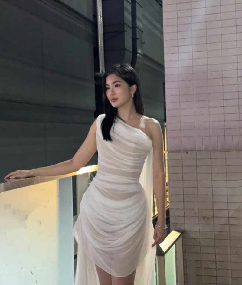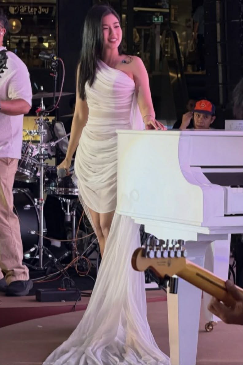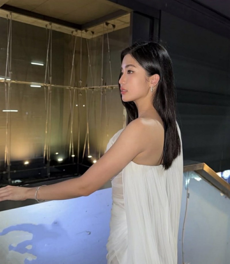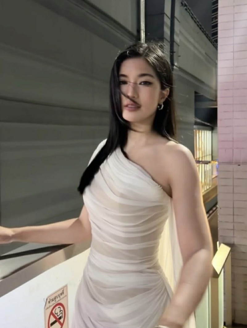 ลุคนี้ ก้อย มาในชุดเดรสสีขาวดีไซน์เปิดไหล่ เผยผิวเนียนสวย พร้อมรูปลักษณ์ที่ดีทุกสัดส่วน เสริมด้วยเมคอัพ และทรงผมที่ช่วยขับออร่าให้ดูแพงยิ่งขึ้น