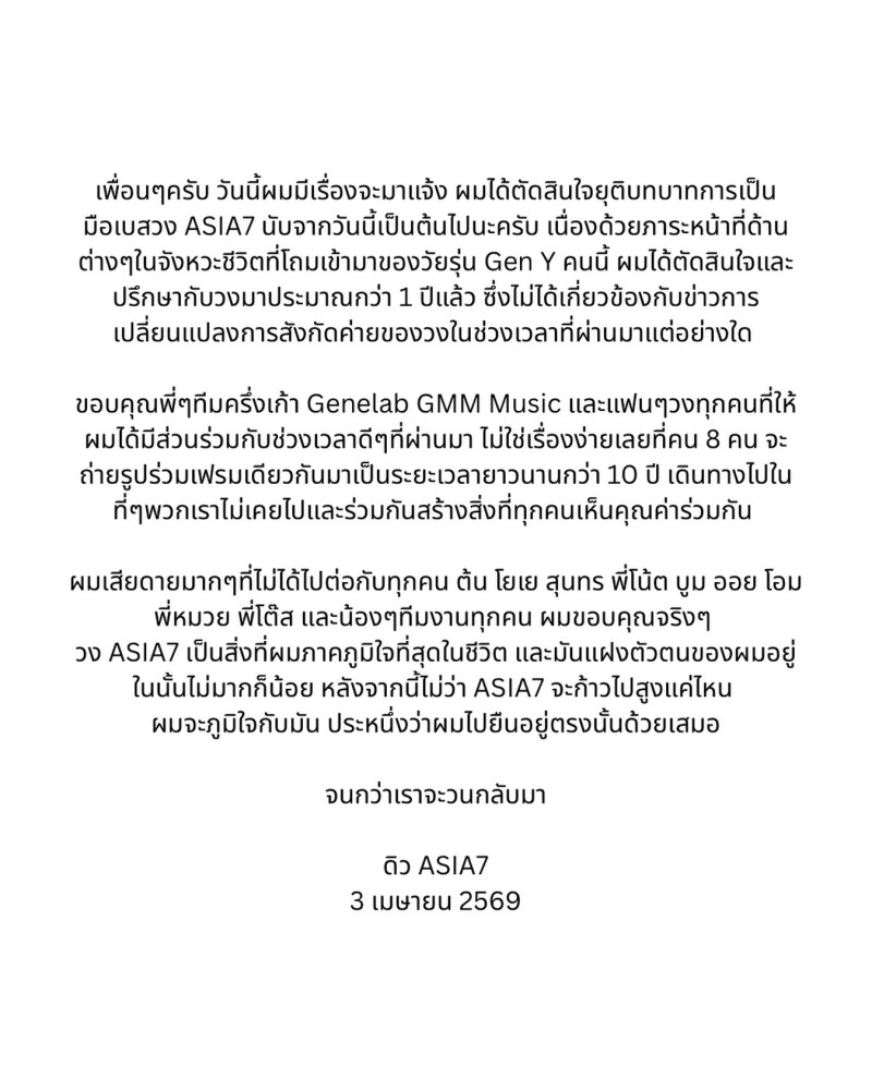 เพื่อนๆครับ วันนี้ผมมีเรื่องจะมาแจ้ง ผมได้ตัดสินใจยุติบทบาทการเป็น มือเบสวง ASIA7 นับจากวันนี้เป็นต้นไปนะครับ เนื่องด้วยภาระหน้าที่ด้าน ต่างๆในจังหวะชีวิตที่โถมเข้ามาของวัยรุ่น Gen Y คนนี้ ผมได้ตัดสินใจและ ปรึกษากับวงมาประมาณกว่า 1 ปีแล้ว